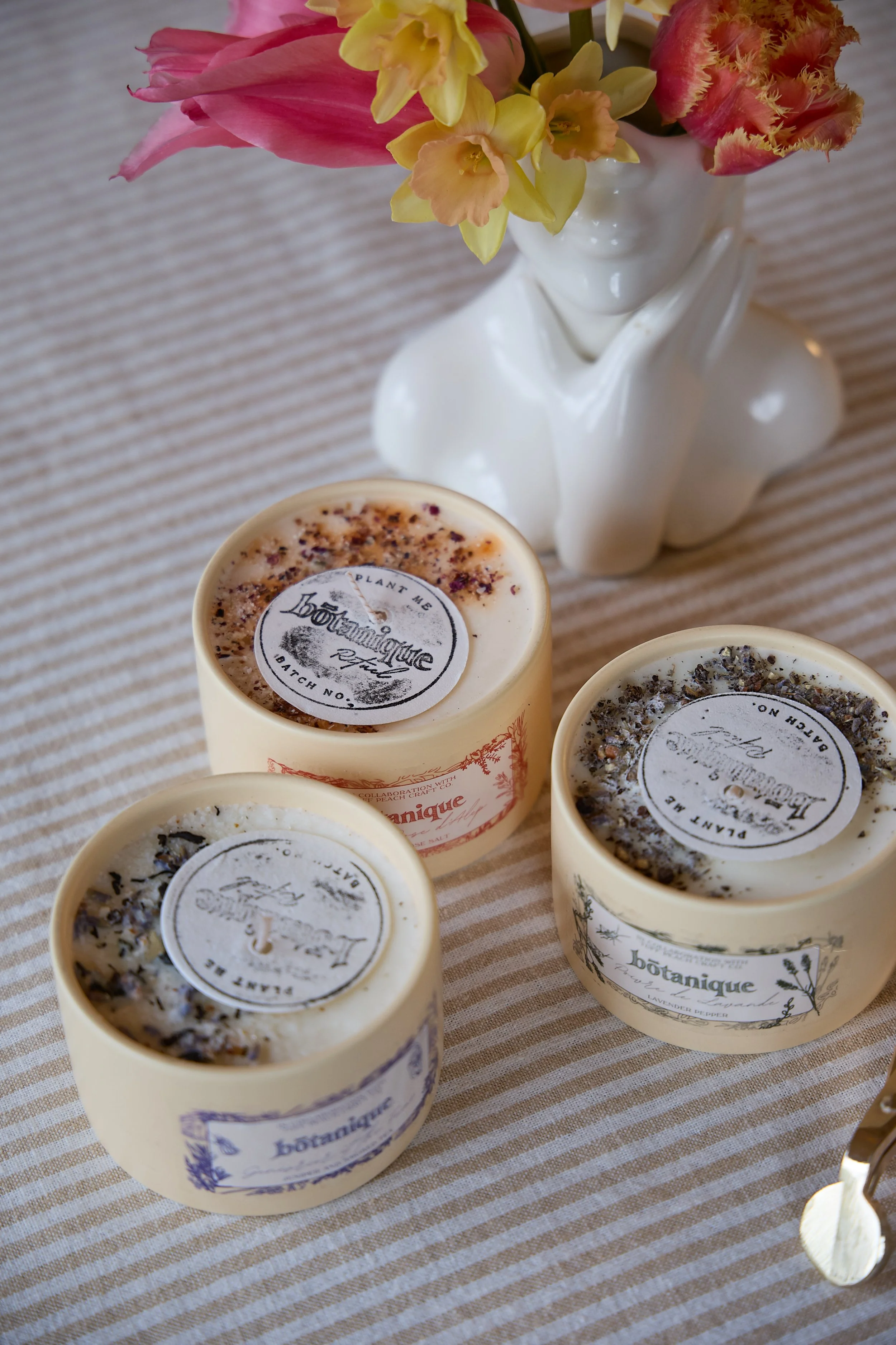 This enchanted collaboration with my darling friend Dallas of Tuff Peach Candle Co. featuring my signature “BōTANIQUE Blends”. They’re made with 100% raw organic soy and essential oils with a led-free cotton wick. The RITUEL candles are set in a buttercream ceramic vessel and finished with a sprinkling of the correlating spice to match each scent. Each one is topped with a wild flower seeded dust cover, intended to be planted in your empty vessel once your candle has come to a completion. Continuing the magic through flowers.